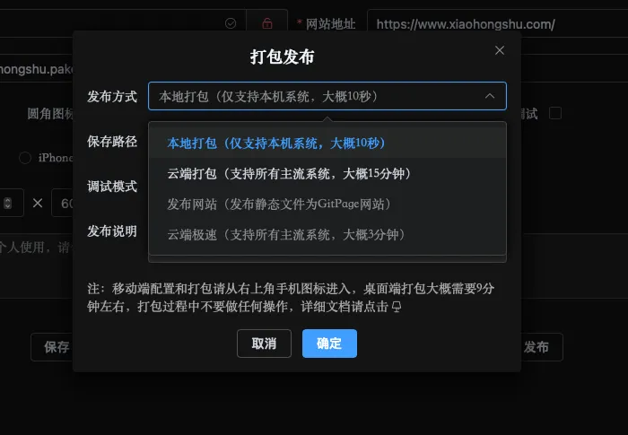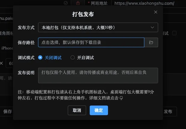 2. 网站地址:就是需要打包的网站地址,填的是小红书的网站链接