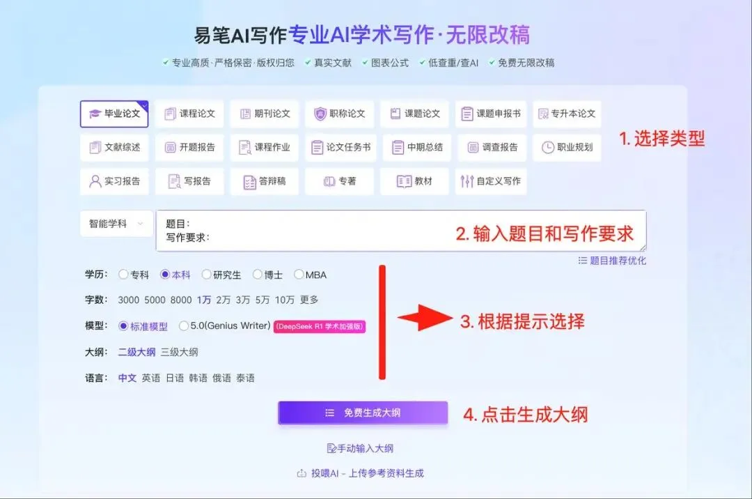 易笔AI论文工具作为一款专业的AI论文写作工具,依托AI5.0与DeepSeek-R1学术加强版模型,能够系统性地辅助完成各类学术论文的创作。无论是撰写毕业论文、期刊论文,还是准备开题报告、中期报告、结题报告或文献综述,它都能在全流程中提供高效支持。在写作起步阶段,易笔AI论文工具根据用户关键词快速生成10个选题,并生成三到六级论文大纲。进入内容创作环节,其强大的AI论文生成能力包含:精准抓取并引用知网、万方真实参考文献和数据,真文献标注;支持投喂AI;支持包括中文、英语、日语、泰语、俄语、西班牙语等多语种创作;支持插入公式、代码、图表、技术路线图。支持LaTeX公式自动排版;此外,平台支持基于论文内容一键生成答辩PPT、答辩稿、任务书、调查报告等,也提供