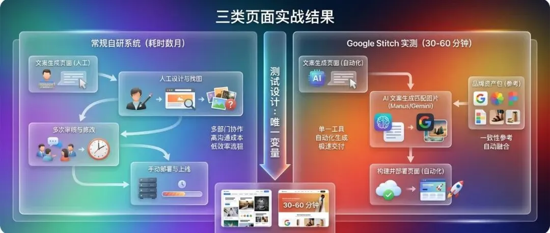 关键差异在于图片。Manus 工作流生成的定制图片与软文的编辑风格浑然一体,而 Stitch 的图片处理尚可但未到同等水平。对软文而言,图片质量和真实性决定页面成败——这是区分「内容感」与「广告感」的分水岭。
