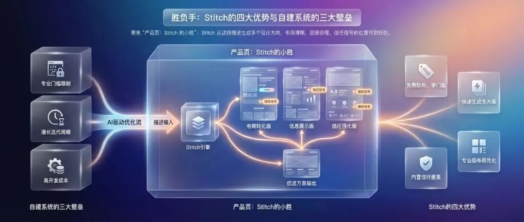 Stitch 让「快速生成多版本 → 投放真实流量 → 数据驱动迭代」的循环成本趋近于零。当竞争对手能在几小时内测试你一周才能验证的假设,优化频率本身成为护城河。