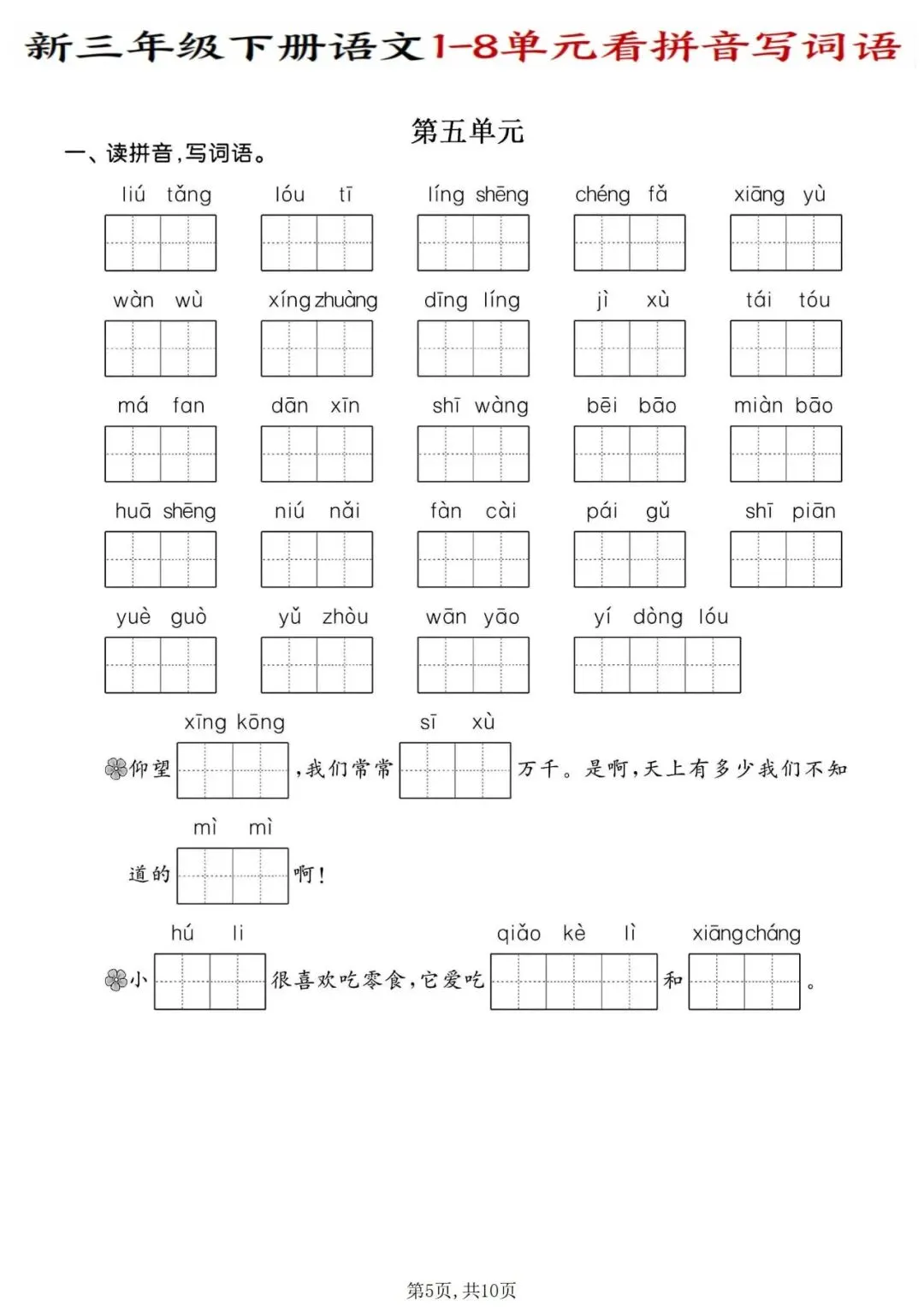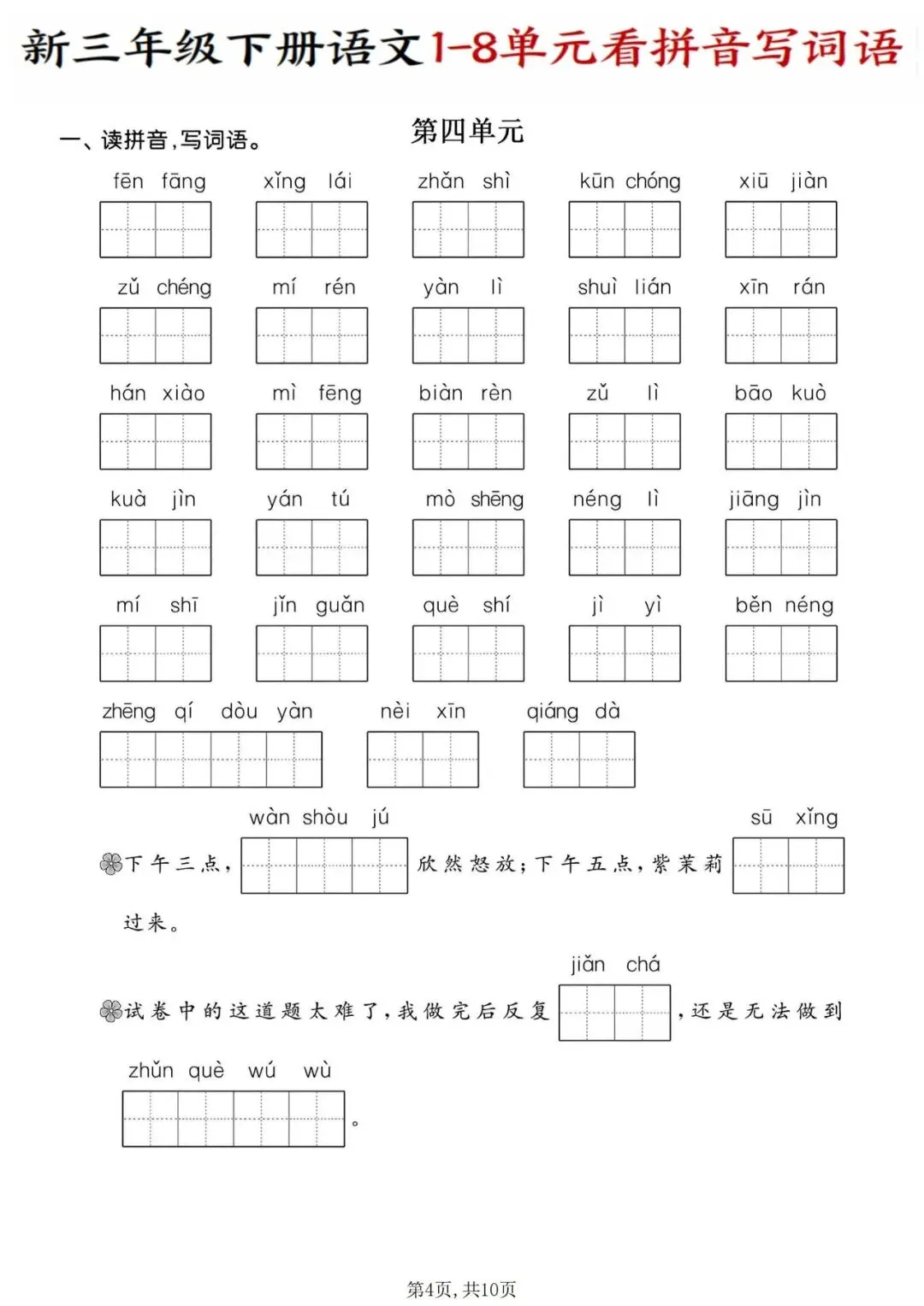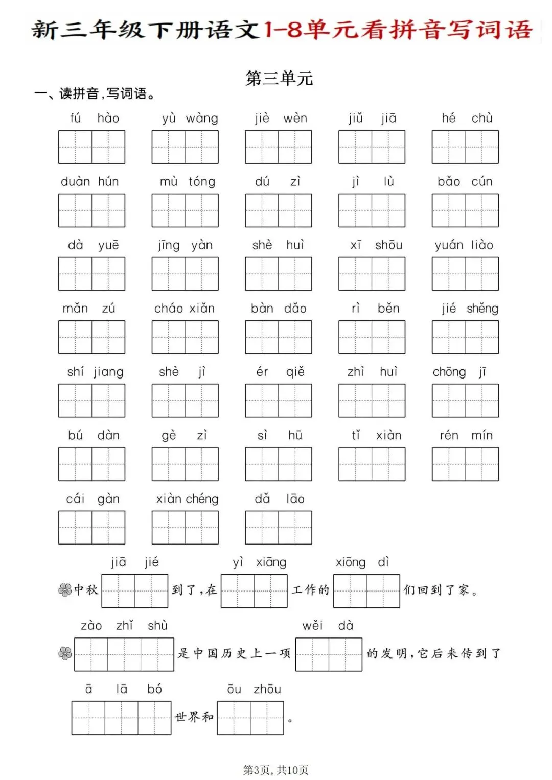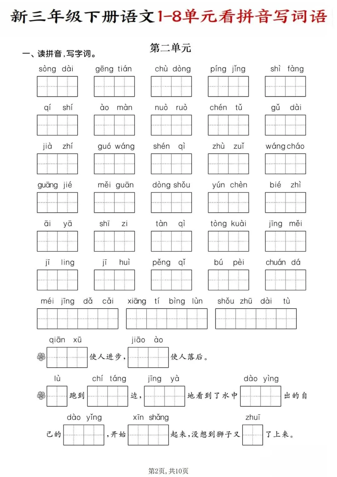 26年春三年级下册语文看拼音写词语,电子版可打印 26年春三年级下册语文看拼音写词语 资料领取方式 (温馨提示:文末有完整电子版资料领取方式) 免费领取完整电子版资料: 单击阅读原文直接获取下载地址 单击阅读原文直接获取下载地址