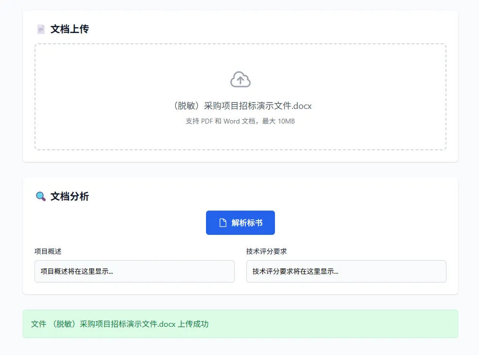 喂给它“标书”:你只需要将招标文件(支持Word和PDF格式)上传给这个工具。 -