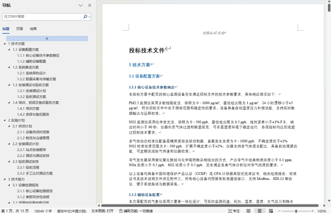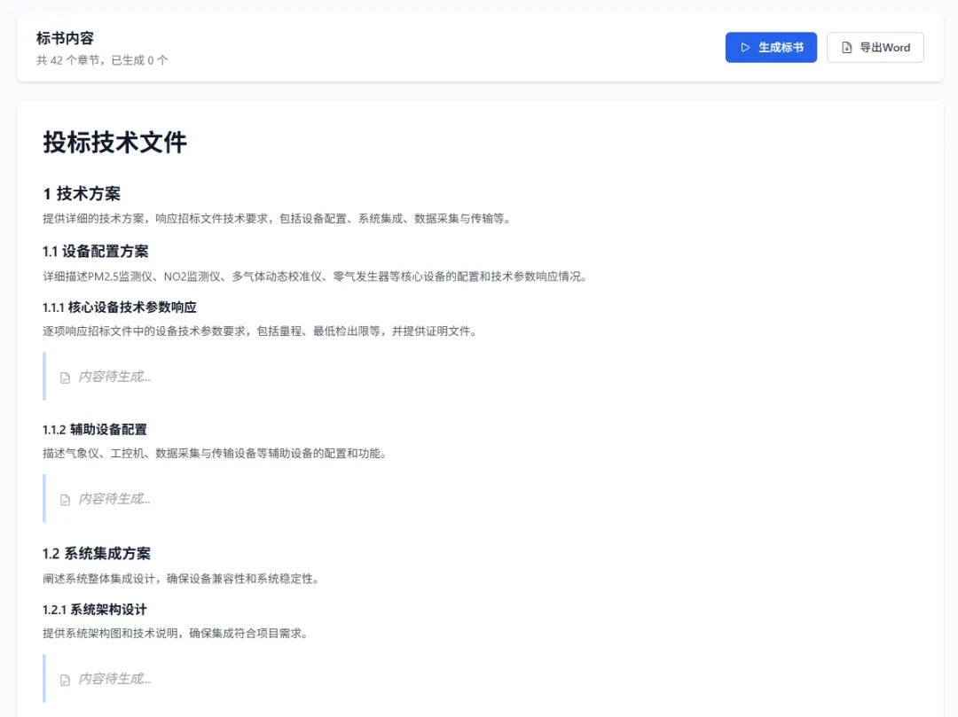 生成内容骨架:基于上一步的分析,它会智能生成一份结构专业、层次分明(通常到三级目录)的标书大纲。 -