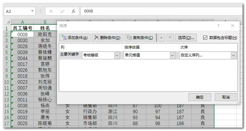 返回“排序”对话框后,次序列标框自动变为自定义排序,单击“确定”后即可按照员工的考核等级排序数据。