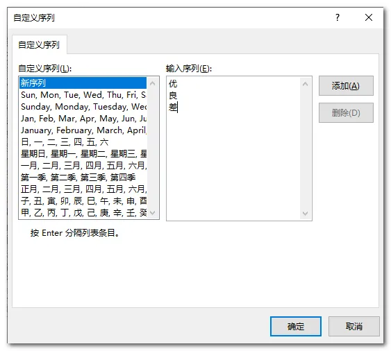 在打开的自定义序列对话框的“输入序列”文本框下输入“优,良,差”,单击“添加”按钮,单击“确定”按钮推出排序。