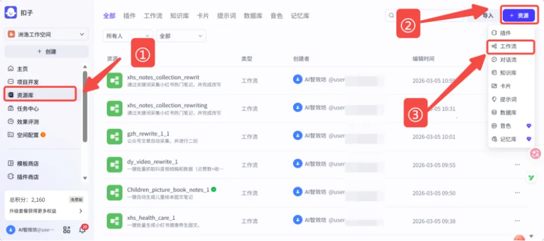 2、新建工作流:点击“资源库”→点击“资源”→点击“工作流”