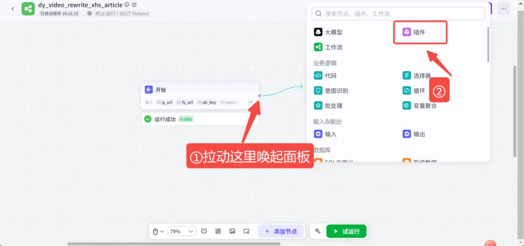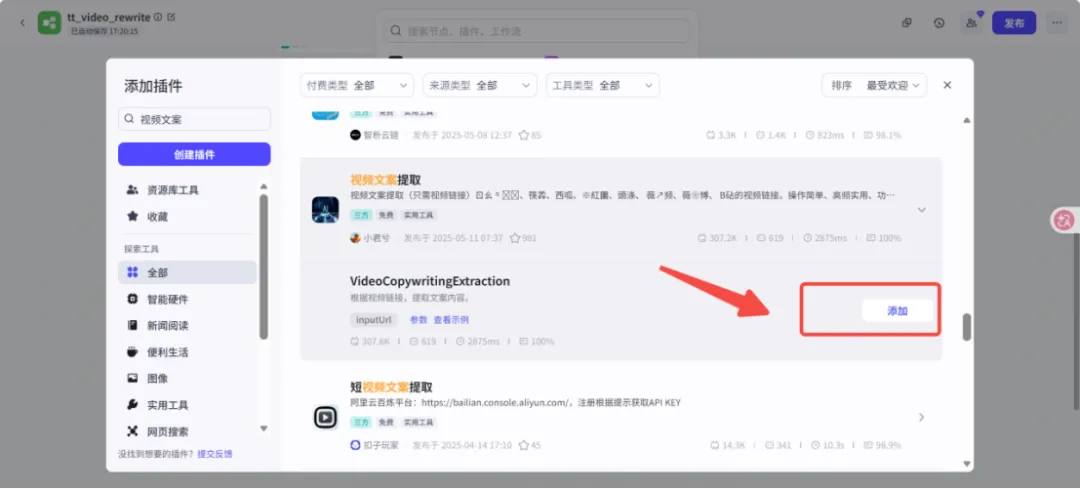 ①否则结点后面添加“视频转文字”插件节点,找到“视频文案提取”插件。