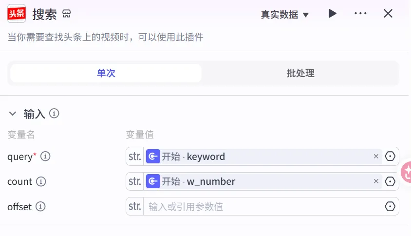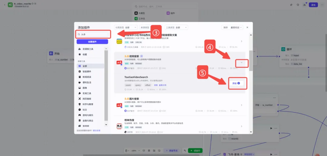 1)添加插件:插入插件→搜索“头条”→找到“头条视频搜索”→点击添加“ToutiaoVideoSearch”。