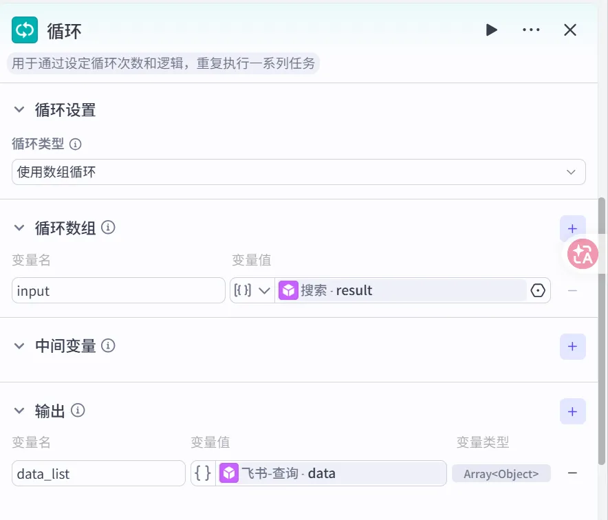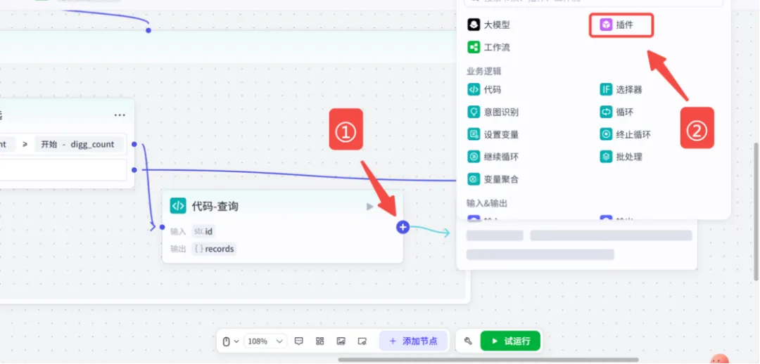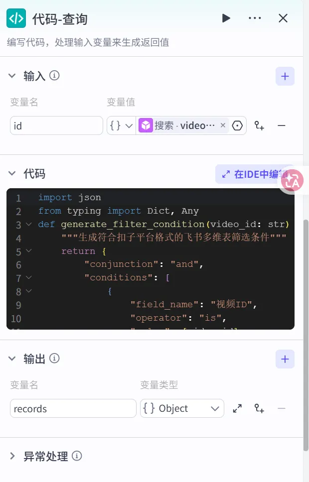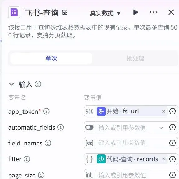 ①在【查询】代码节点后面,添加一个飞书多维表格【查询记录】插件节点,这里的作用是把上一个【查询】代码节点的记录存在飞书多维表格上。