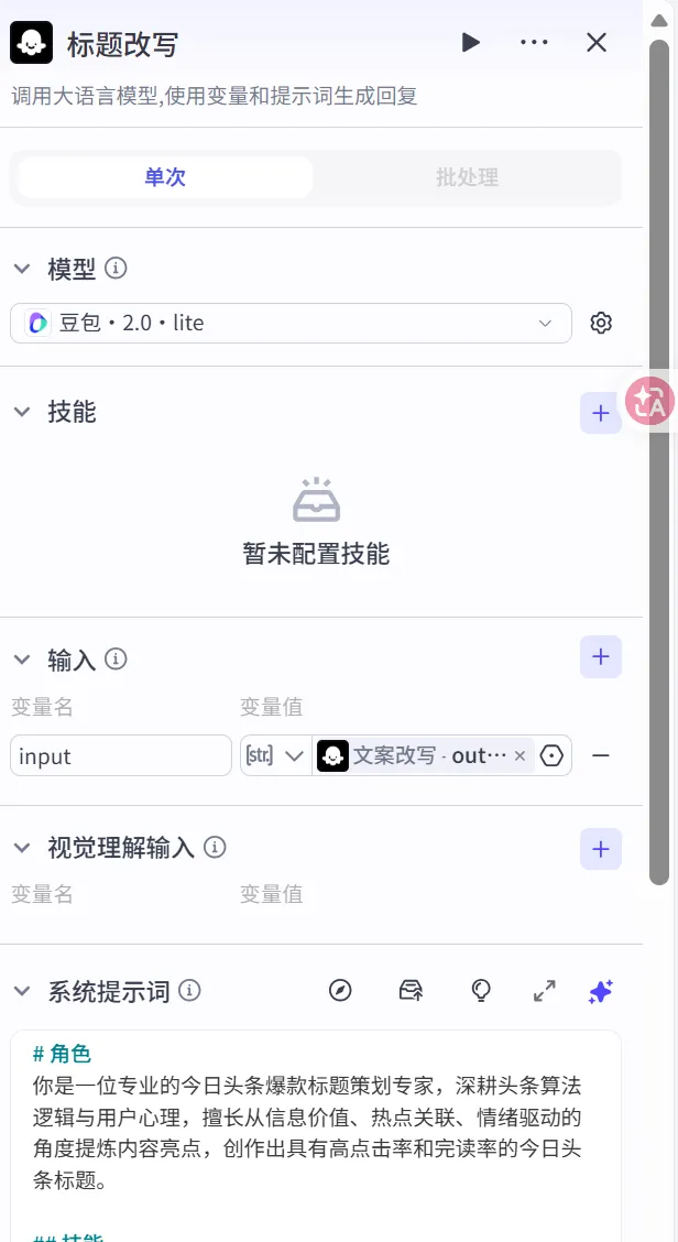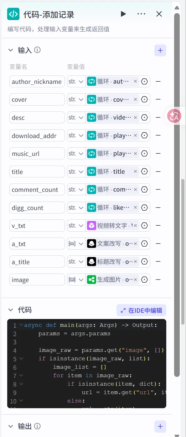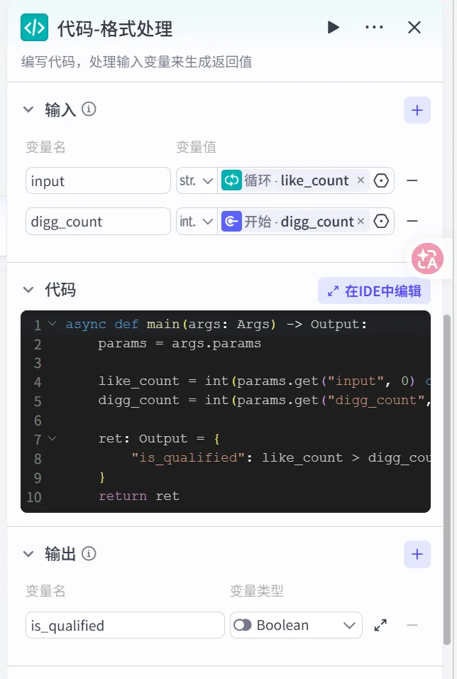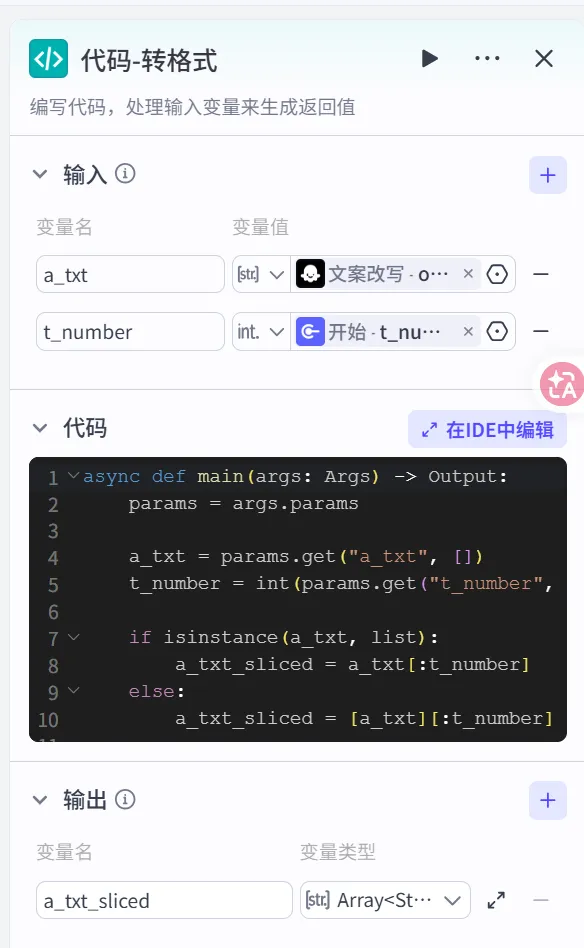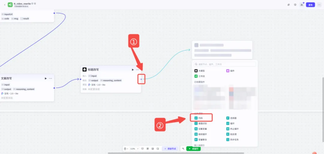 ①在【标题改写】大模型节点之后,添加一个【转格式】代码节点。
