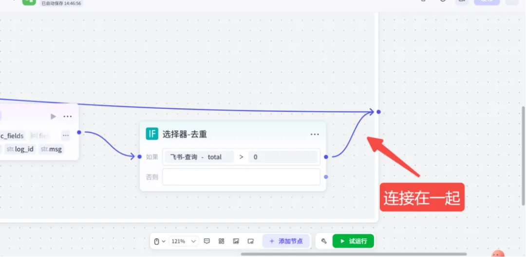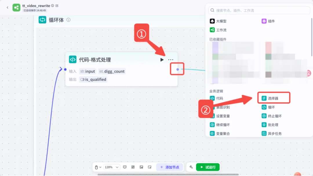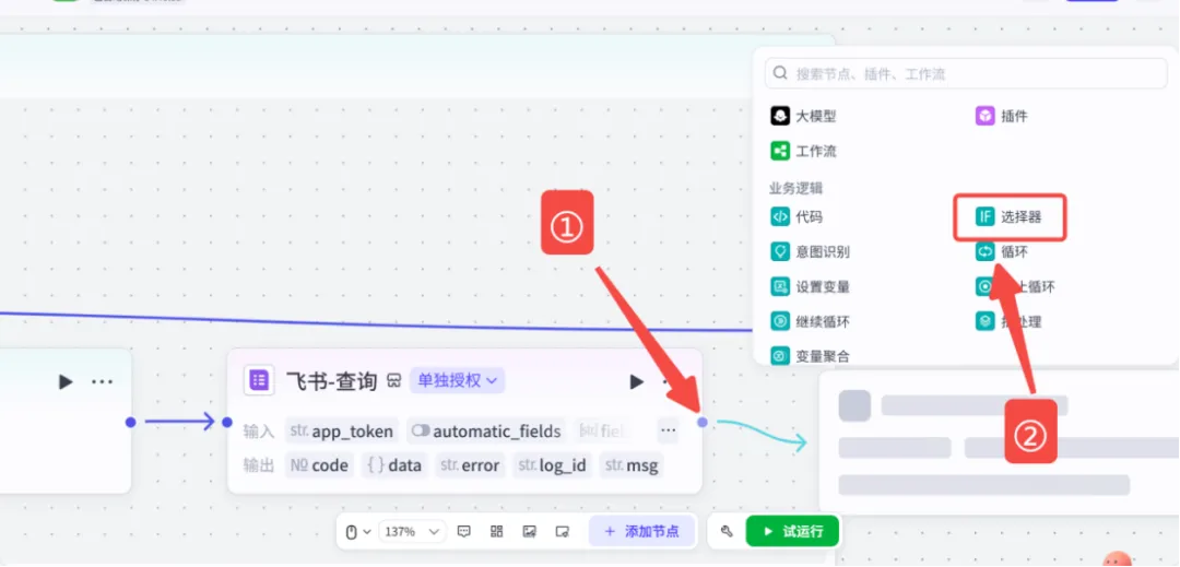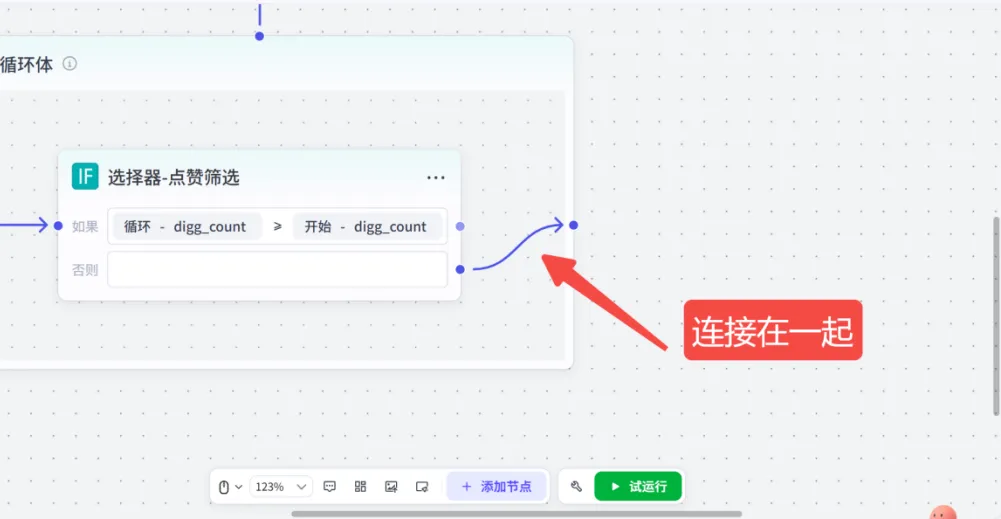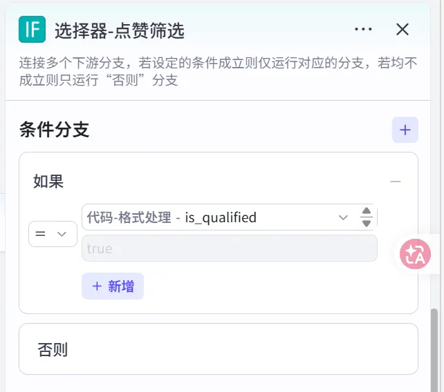 ①添加一个 【IF选择器】,这个节点的作用是根据“点赞数”筛选笔记。
