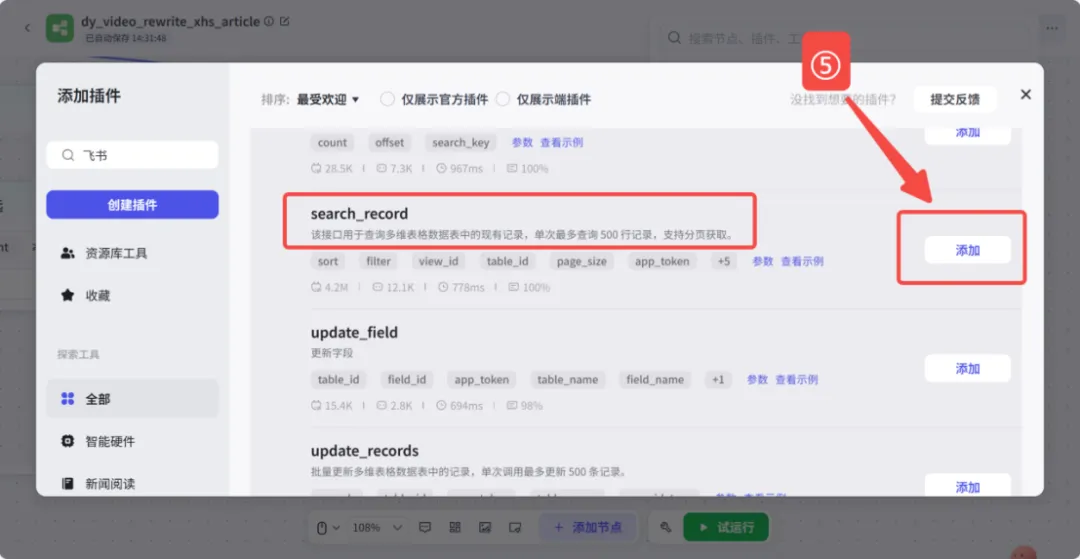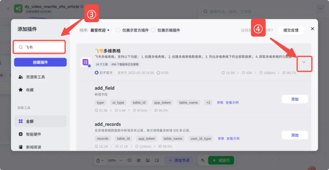 添加步骤:插入插件→搜索“飞书”→找到“飞书多维表格”→点击添加“search_record”。