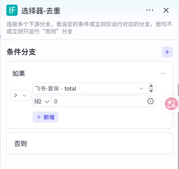①在【飞书-查询记录】插件节点后面,添加一个【IF选择器】节点。作用是过滤掉第二次及之后可能之前已采集过的内容。