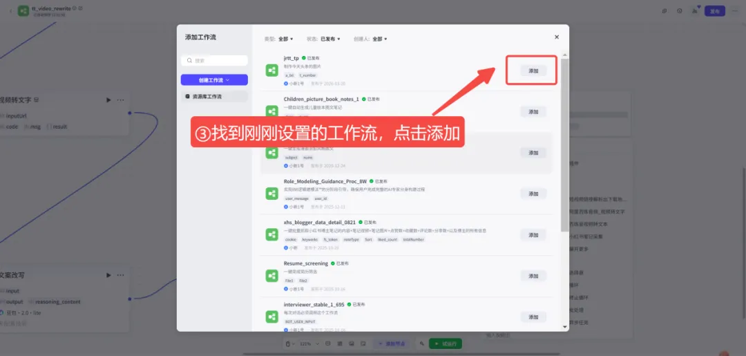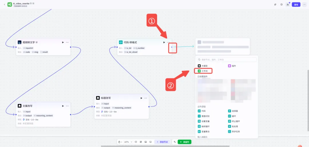 ⑤回到原来的工作流上,在【代码-转格式】节点后面把【子工作流】添加上去。