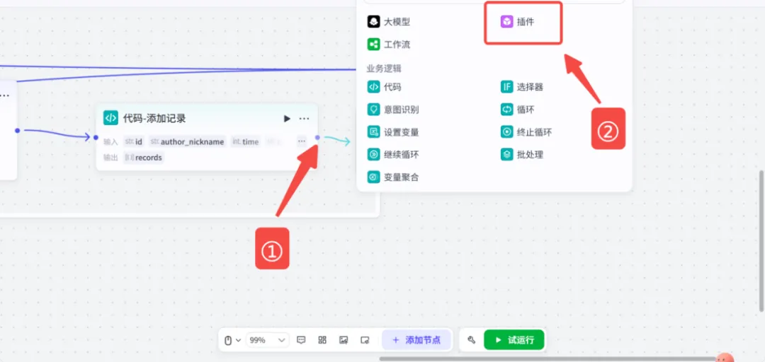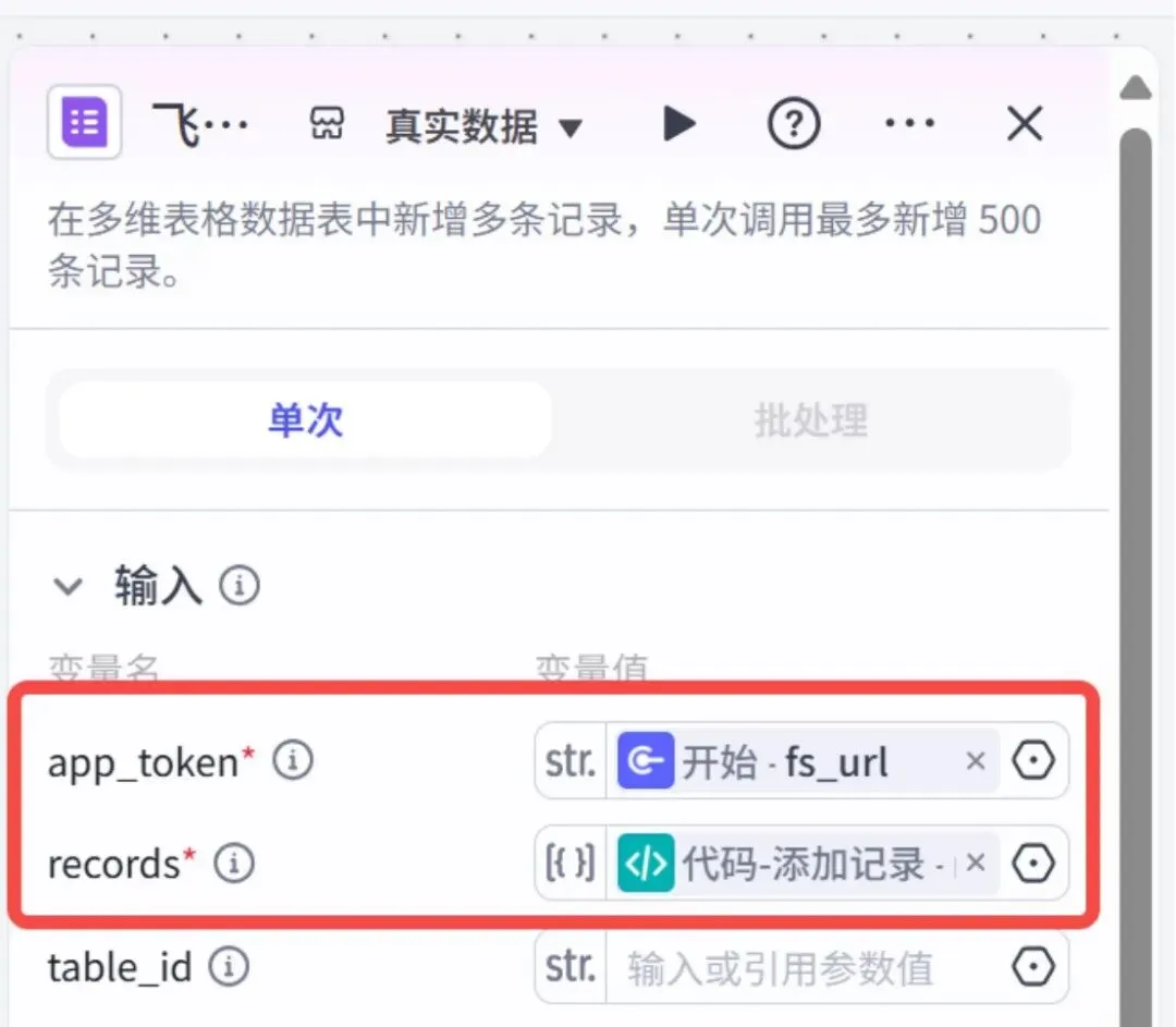 ①在【代码-添加记录】节点后面,添加一个飞书多维表格【添加记录】插件。这里的作用是把需要的数据写入表格上面。