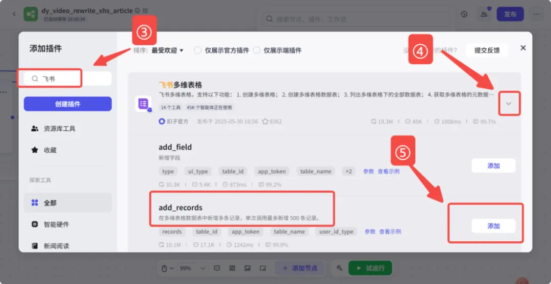 添加步骤:添加插件→搜索“飞书”→找到“飞书多维表格”→添加“add_records”。