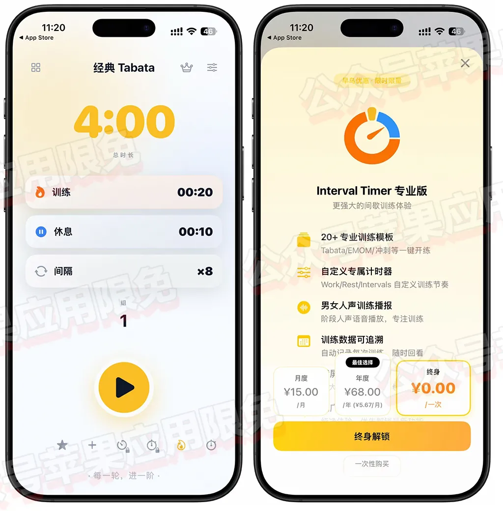 一款极简且专业的间歇计时工具,目前可以免费获取它的终身订阅,打开软件点击顶部皇冠进入内购,终身显示0即可免费获取,设备需装有iOS 17.0或更高版本。
