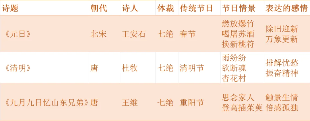 《元日》写的是春节,《清明》写的是清明节,《九月九日忆山东兄弟》写的是重阳节。