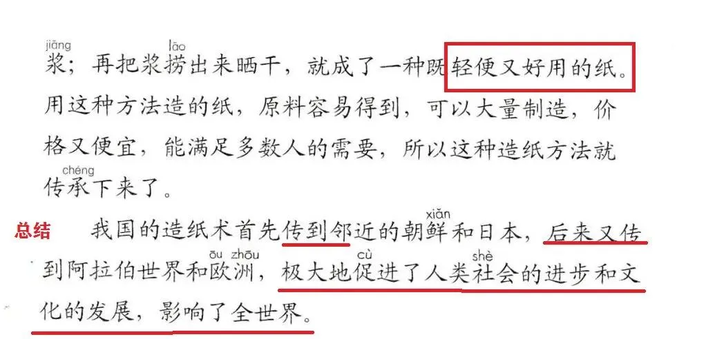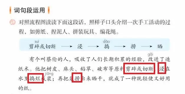 这段话运用了丰富的动词(已框处)和表示承接的关系词“再”,介绍了蔡伦造纸的方法和过程,具有很强操作性。