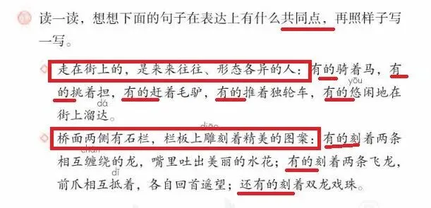 如图可以发现,这两段话都是“总分”结构,先写出一段话的中心句,然后用“有的……有的……有的……”,做到“围绕一个意思把一段话写清楚。”