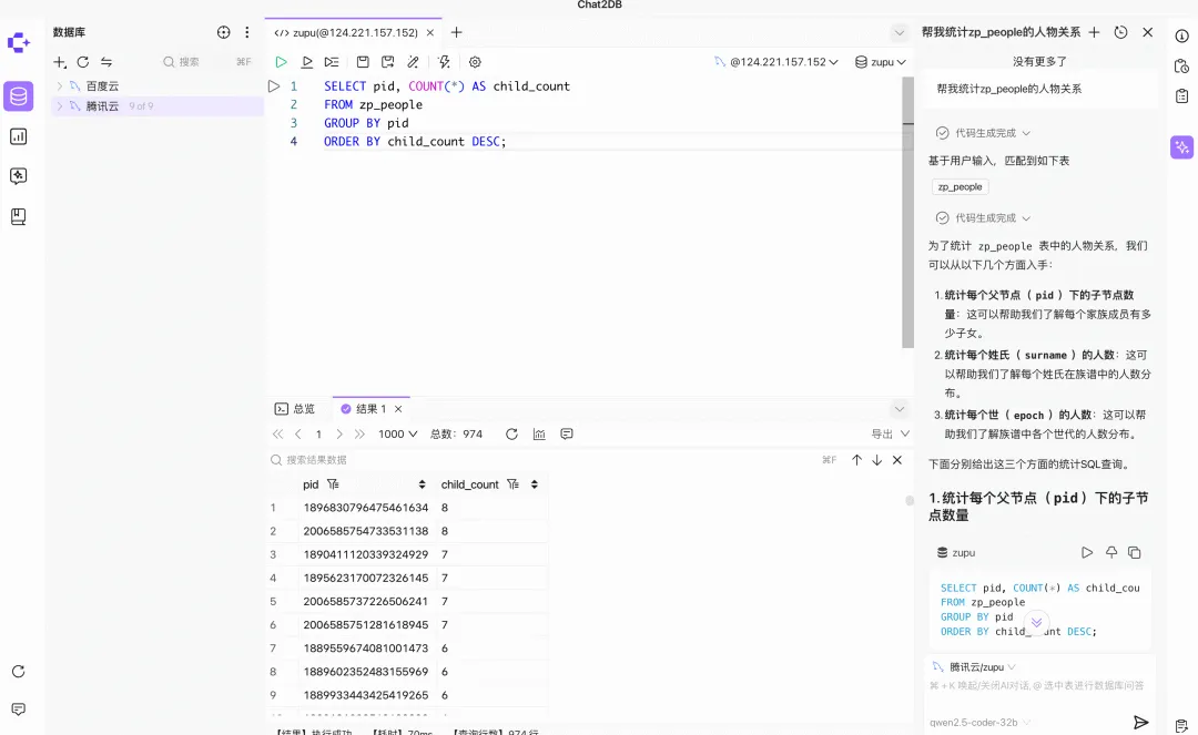 在实际使用中,右侧AI对话面板可以直接用自然语言描述需求,中间SQL编辑区自动生成对应语句,下方展示查询结果,整个流程流畅直观。