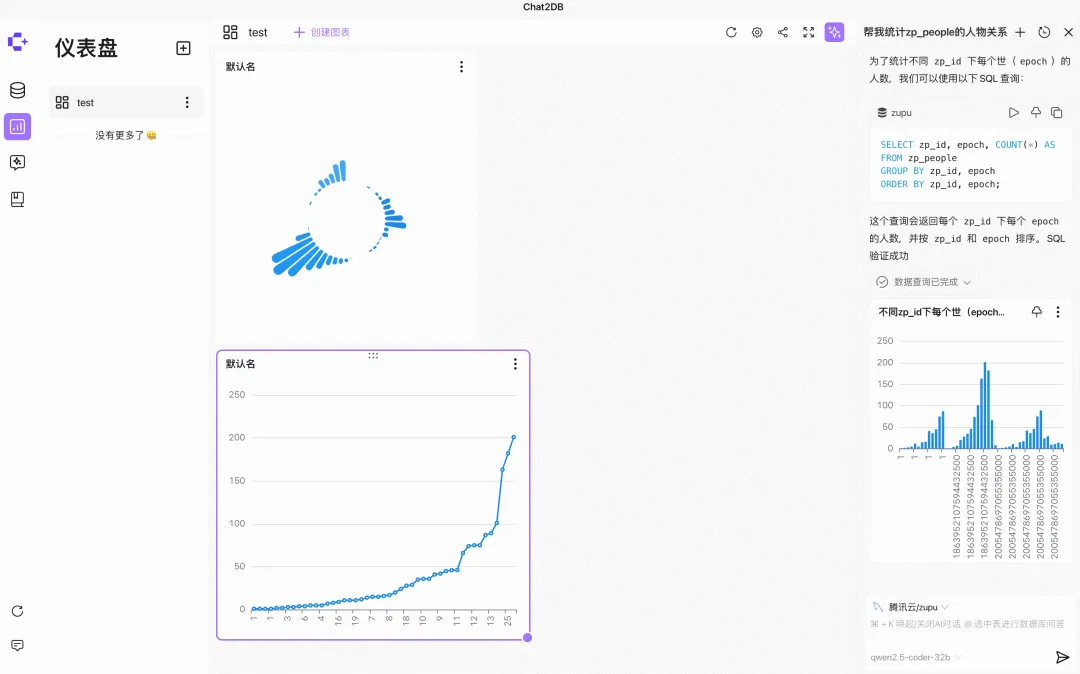 仪表盘界面中,AI助手可以直接生成SQL查询并自动转化为可视化图表,大幅简化了传统BI工具的配置流程。