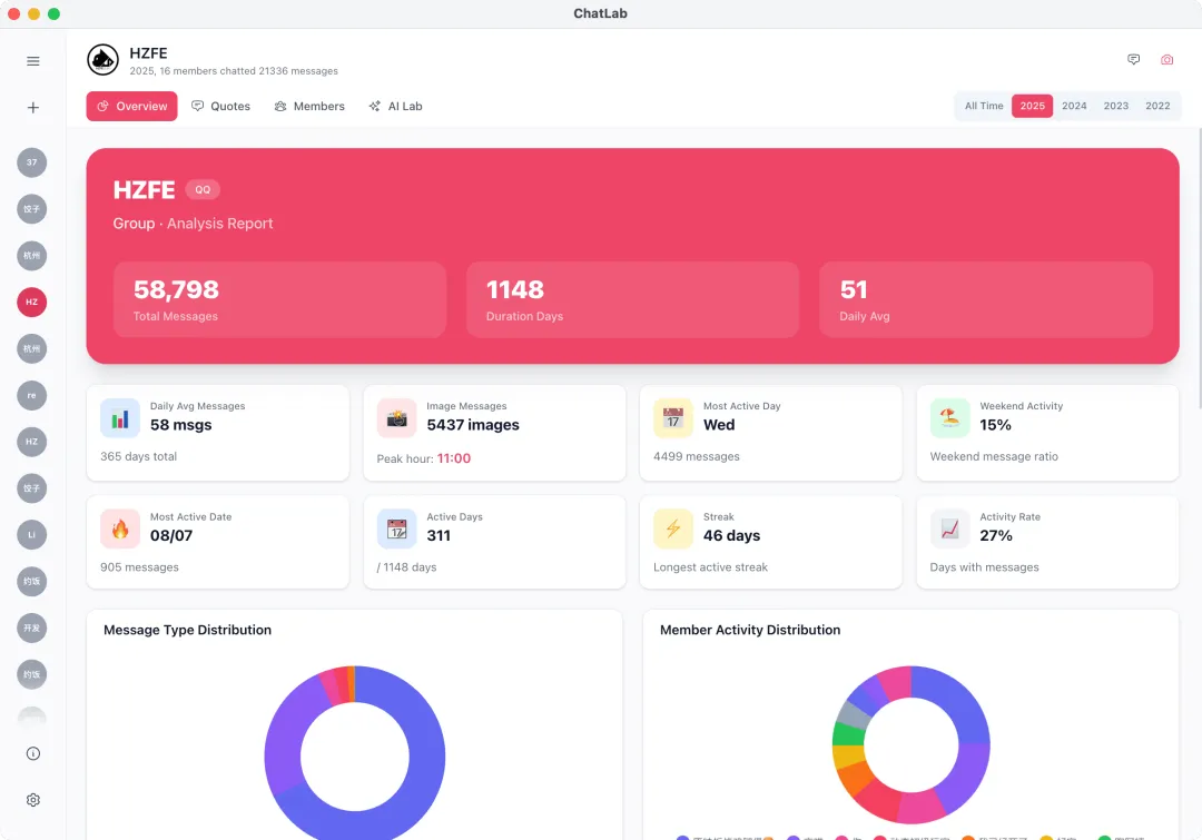 聊天总览,一眼看清群聊全貌:消息量、活跃时段、成员排行,数据一目了然。