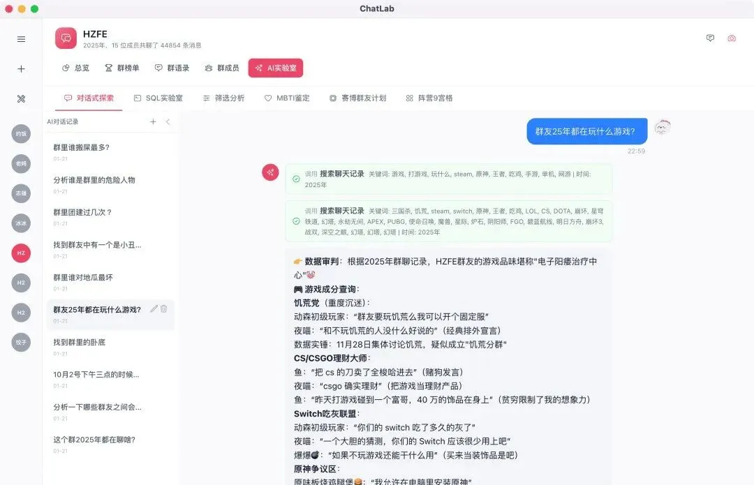 ChatLab 就是干这个的——一个开源、免费、数据全部留在本地 的聊天记录分析工具。它的核心思路很简单:把你的聊天记录灌进本地 SQL 引擎,再用 AI Agent 帮你挖掘那些藏在对话里的有趣规律。
