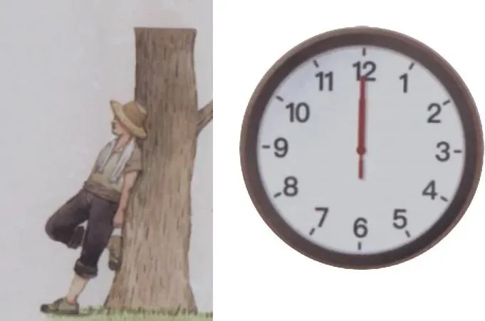这两个是画面猜谜, 分别是“人”在“木”旁(休),十二点→十加两点(斗)。