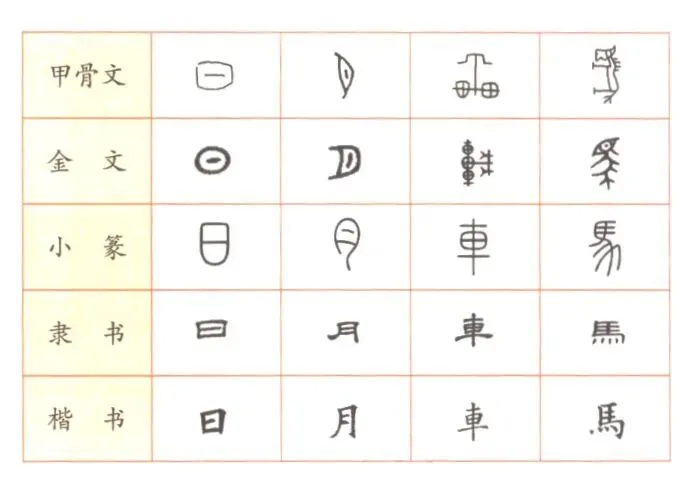 小结:课文首先用表格的形式,以“日、月、车、马”四个字为例,展示了几千年来汉字的演变过程,并一一介绍了甲骨文、金文、小篆、隶书、楷书等出现的时间以及特点。