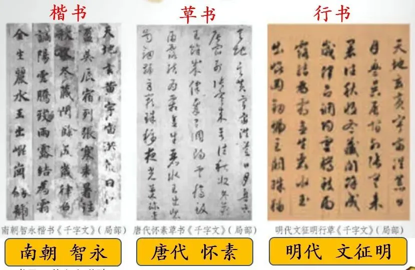 (1)智永楷书:智永和尚,南朝人,本名王法极,字智永,会稽山阴(今浙江绍兴)人,书圣王羲之七世孙,是王羲之第五子王徽之的后代,号“永禅师”。智永对后世书法影响深远。他传“永字八法”,为后代楷书立下典范。所临《真草千字文》八百多份,广为分发,影响远及日本。即使现在,依然是书法学习的经典教材。