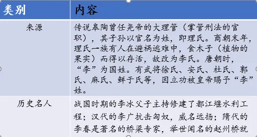 1.“李”姓的来源传说是上古时代的“理”姓。唐朝时,大量姓氏改为“李”姓,这可能为后来“李”姓人口的增长奠定了基础。