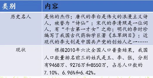 2.历史上,“李”姓名人辈出。有水利专家李冰父子、军事将领李广、桥梁专家李春、“诗仙”李白、词人李清照、药物学家李时珍、革命领袖李大钊……他们在各个领域都闪耀着光芒。