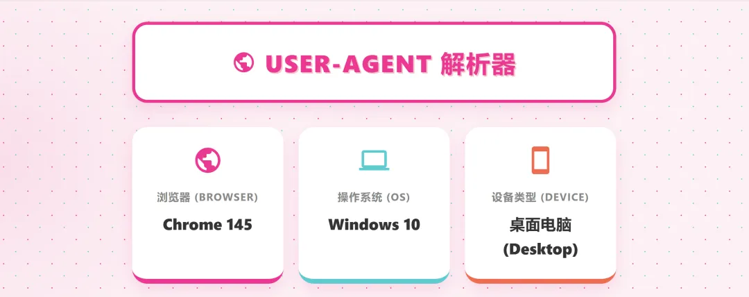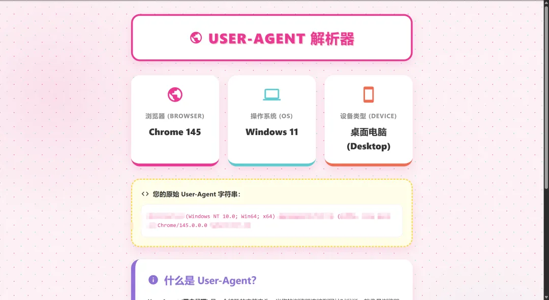 为我开发一个User-Agent解析器,具体要求如下: 1. 使用 HTML5 实现,所有功能代码必须整合在单个 HTML 文件中 2. 实现一个User-Agent解析器工具: – 主要是解析浏览器User-Agent字符串,显示设备、操作系统和浏览器信息。 – 添加User-Agent的科普介绍。 – 页面使用多巴胺配色。 – 需求适配移动端设备。 |
