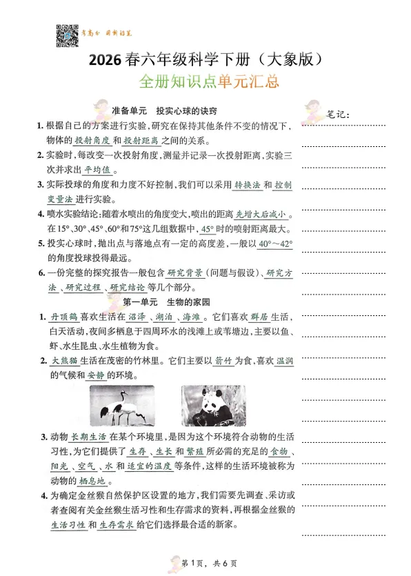 【可下载】2026年春大象版科学六年级下册知识手册