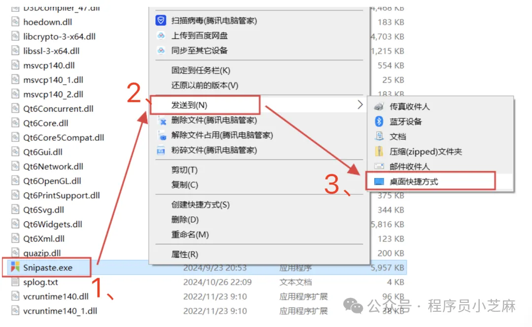 2、找到Snipaste程序,右键点一下,选择“发送到”——“桌面快捷方式”