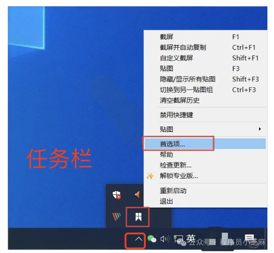 4、在任务栏右下角点开小箭头,找到Snipaste图标,右键选“首选项”,就可以进入设置面板