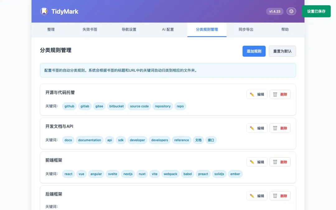 如果你觉得规则分类不够智能,TidyMark 还支持 AI 辅助分类!