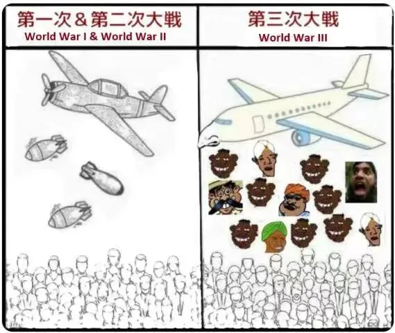 而右边被称作“第三次世界大战”的画面里,投下的不再是武器,而是大量人群的形象。作者想表达的,是一种对时代变迁的担忧:传统的战争靠武力征服,而如今很多地方的改变,正以人口流动、文化交融、社会结构调整的方式悄悄发生。
