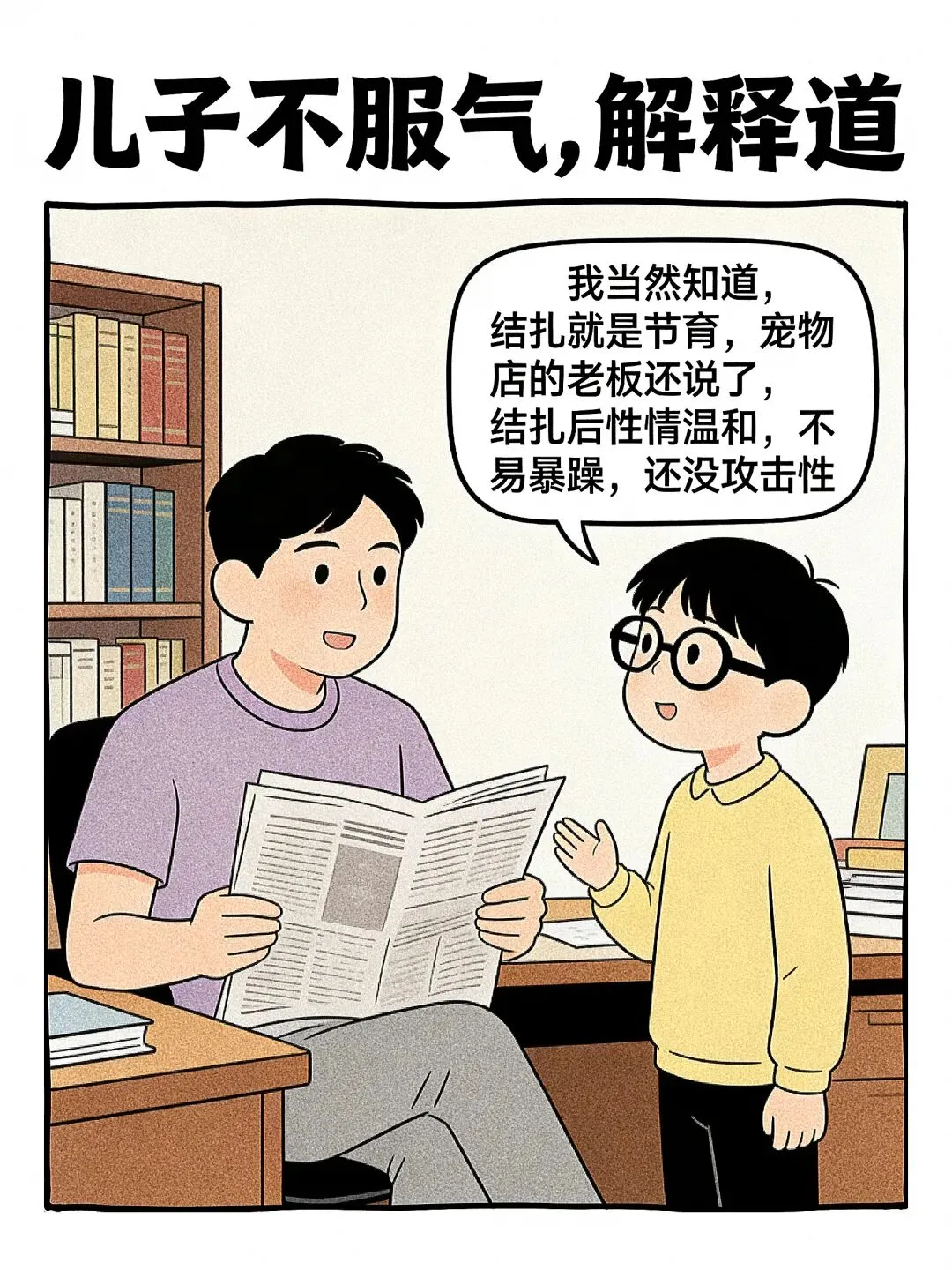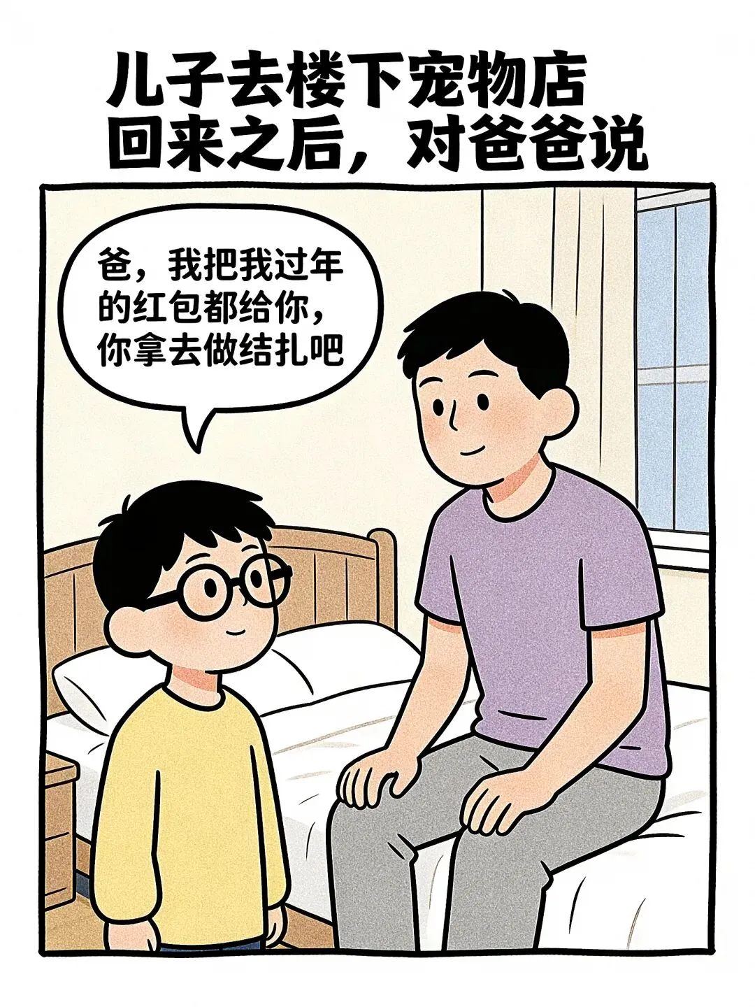 逗笑漫画:儿子:爸,我把红包都给你,你去结扎行不?爸爸:你知道什么是结扎?儿子:宠物店说结扎后性情温和,不易暴躁,还没攻击性