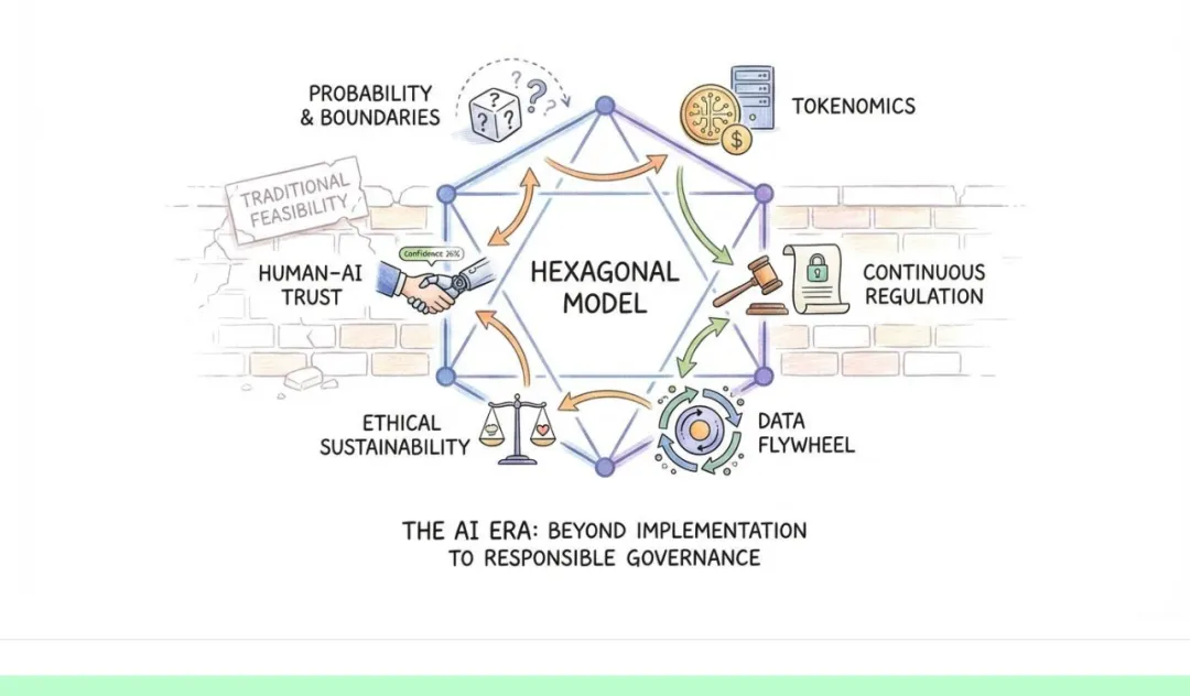 我们正从“工程实现”的时代步入“系统风险治理”的时代。准入门槛的骤降,反而推高了可靠性与责任的门槛。传统的四维度(技术、经济、操作、法律)分析已不足以支撑复杂的智能系统。我们需要一种全新的“六边形模型”,重新审视 AI 驱动下软件的生存逻辑。