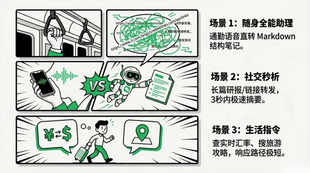社交资料秒分析 : 在群聊里看到一份长篇大论的研报或网页链接,直接转发给 AI,3 秒钟内它就能给你一份精准的摘要。