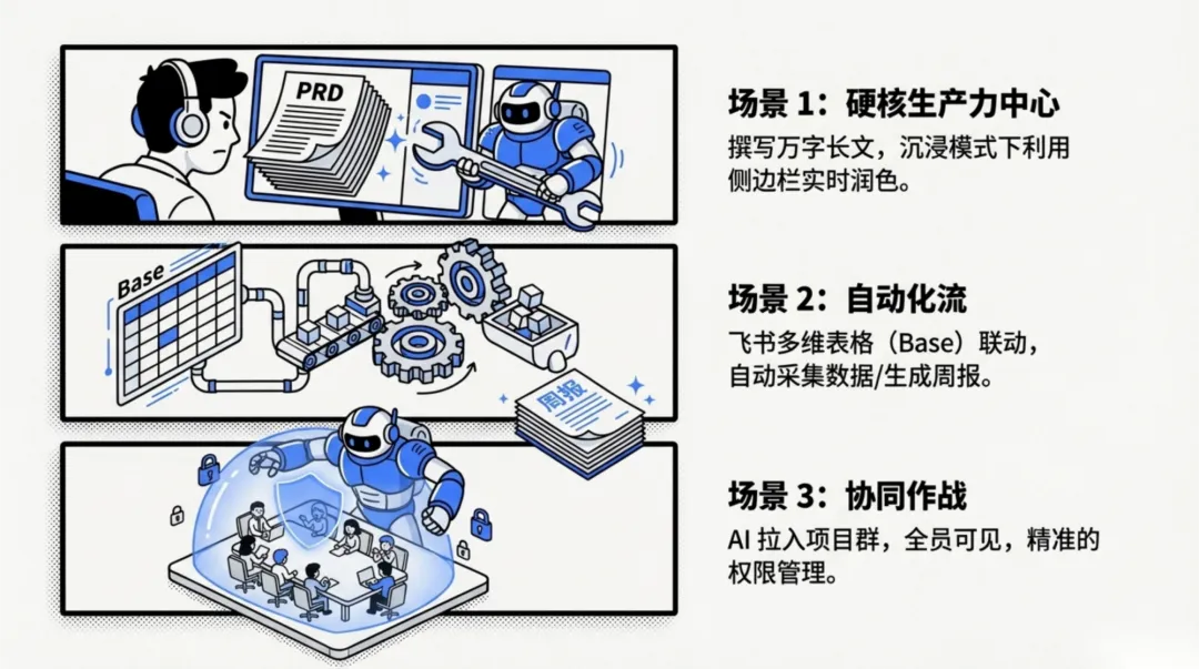 重型文档创作 : 如果你需要撰写上万字的产品需求文档或深度分析报告,飞书的流式输出、侧边栏实时润色功能,能让你在“沉浸模式”下与 AI 深度磨合。