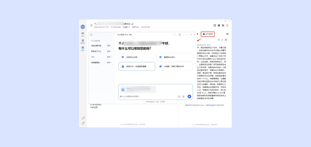 在会议中,您可以在工具栏单击 AI 小助手,打开调起独立弹窗(弹窗支持收起到会中侧边栏)。