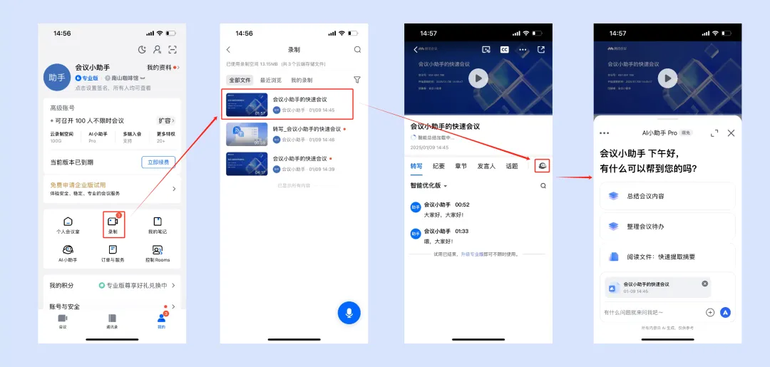 2.在客户端页面单击录制,选择录制文件或转写文件,进入会议详情页,单击右上角 AI 小助手使用。
