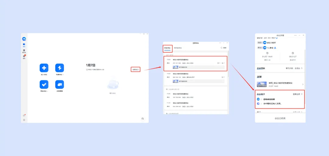 3.在客户端页面单击全部会议,在历史会议中选择某一场会议,单击 AI 小助手旁的查看全部即可使用。