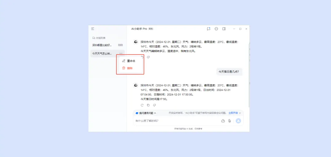 1.在对话列表可以选择您要查看的对话内容,支持对该内容重命名、删除操作。