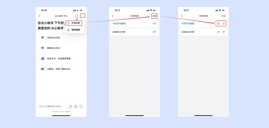 所有对话可保存、查看、重命名、删除。