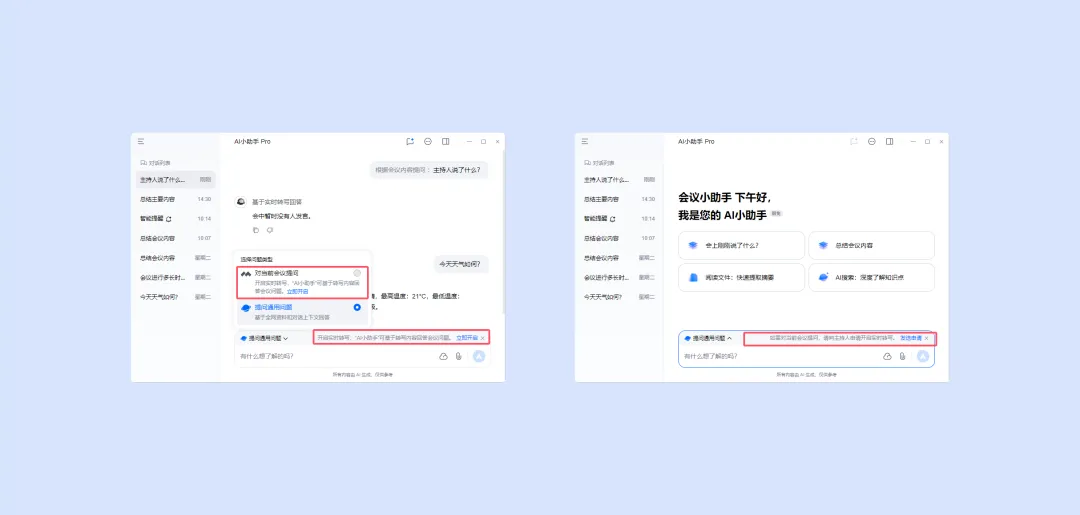 (1)当正在进行一场会议,若会议实时转写已开启,切换至提问会议内容,可对参会期间的会议内容提问。