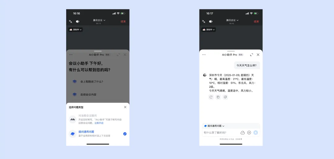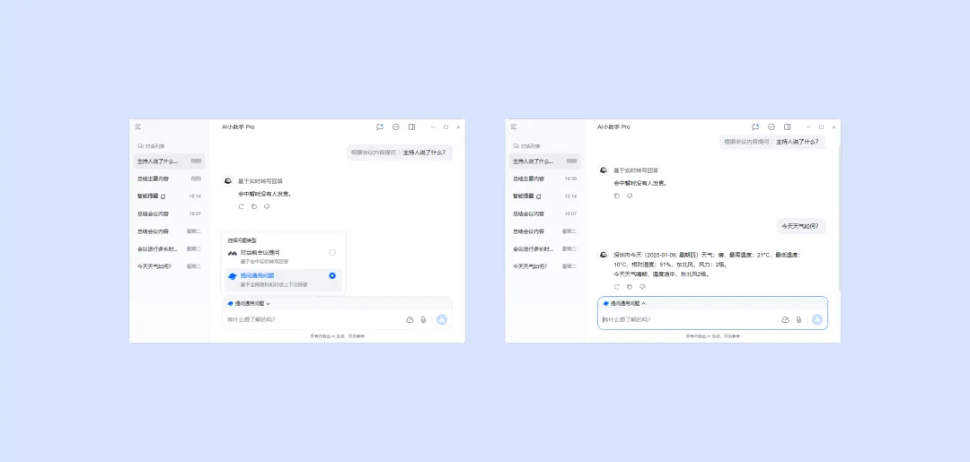 (3)当在会中想提问与会议无关的问题,可切换至提问通用问题,小助手将根据互联网或知识库回答。